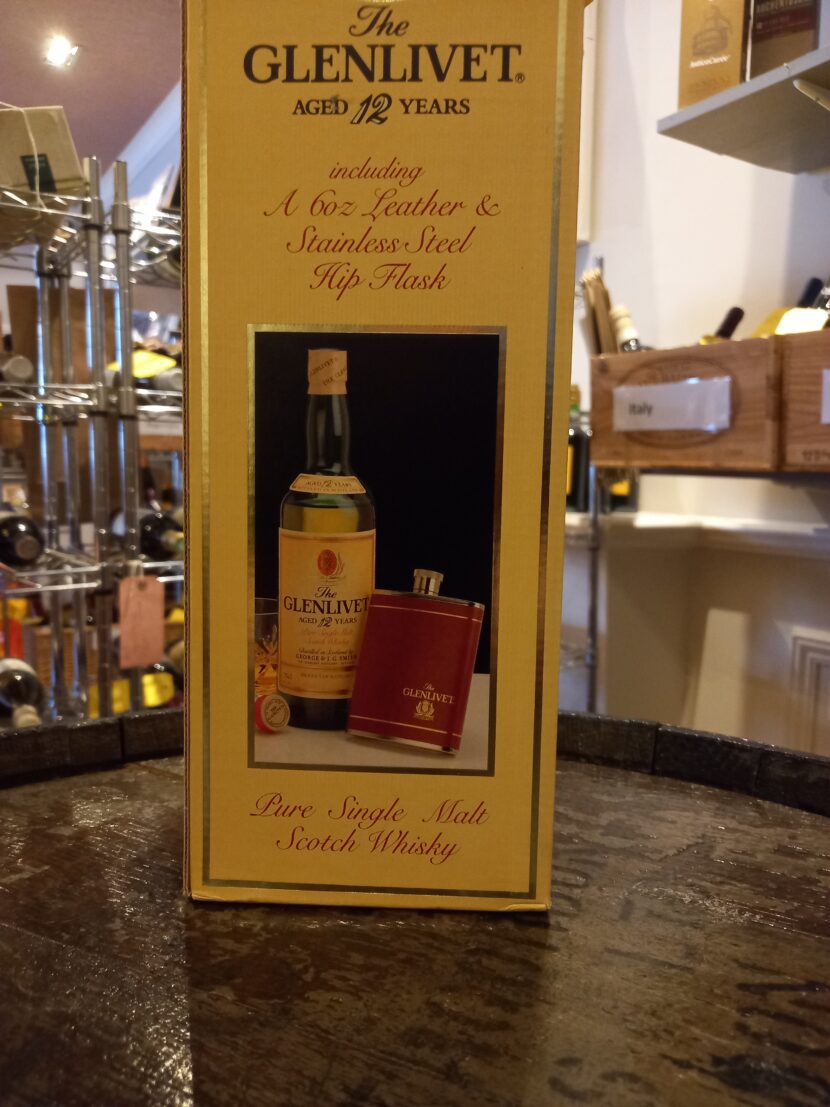 An old bottling of 12 year old from Glenlivet. This was bottled in the 1980s and comes complete with a 6oz Leather and stainless steel hip flask, both in original packaging for the collector.
